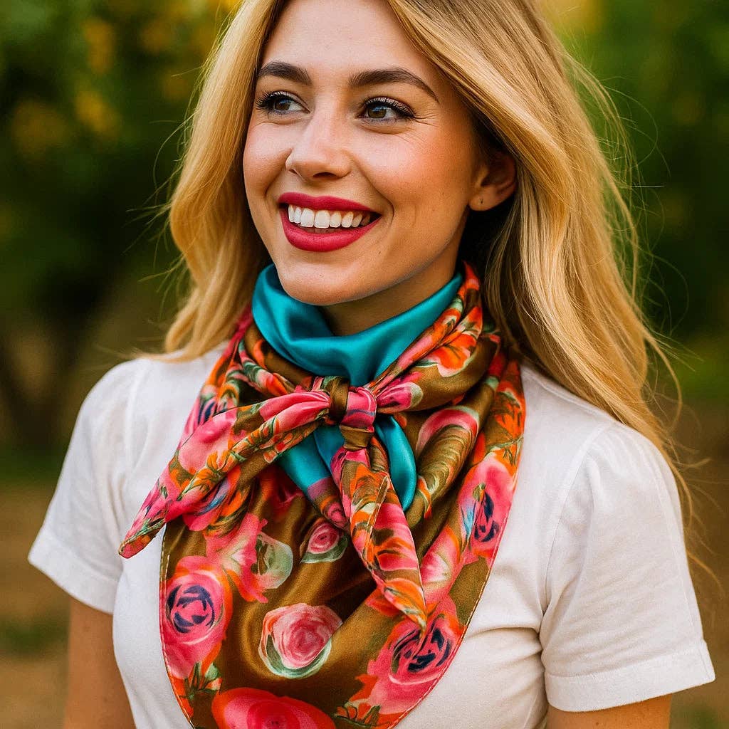 Our classic wild rag/scarf in blue, pink green and brown with roses.