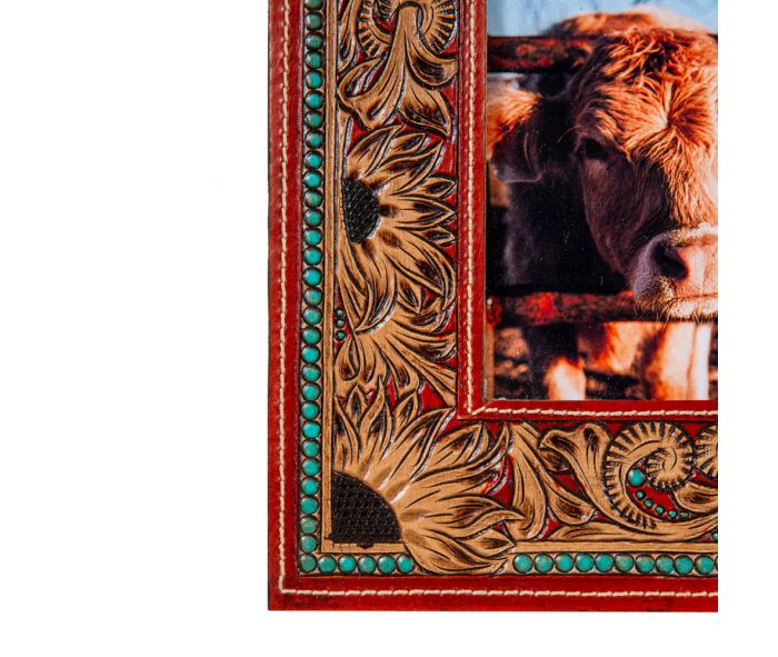 Hand-tooled leather frame is beautifully detailed with turquoise beaded edge accent.