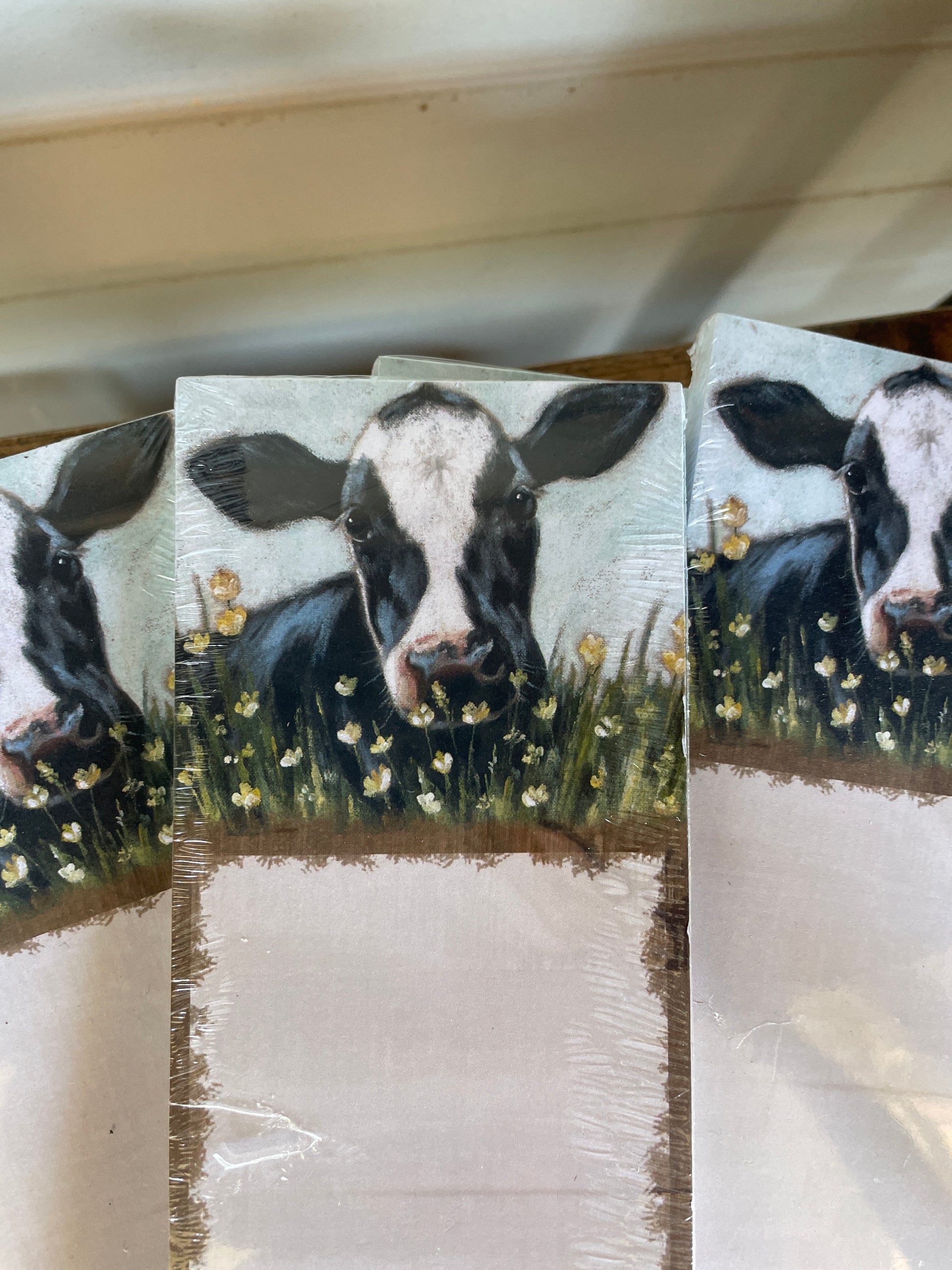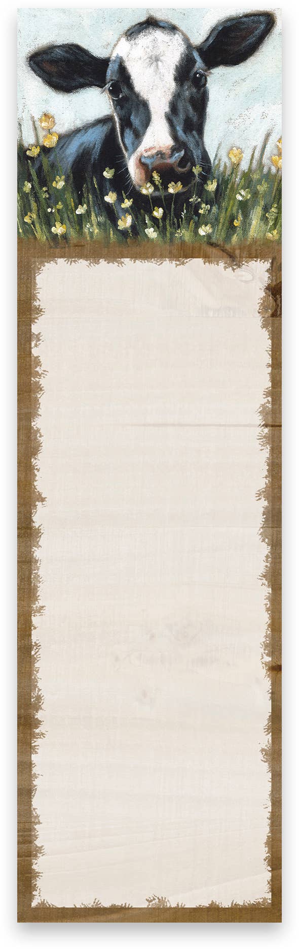 A list notepad featuring a cow in a field with flower designs. Design is replicated from original artwork painted onto burlap canvas, giving the art a unique depth and texture. List notepad includes 60 pages and strong magnet.