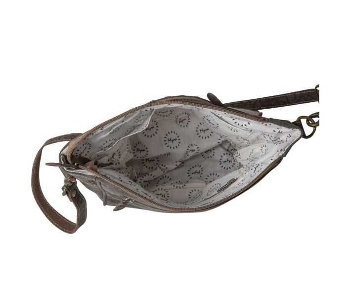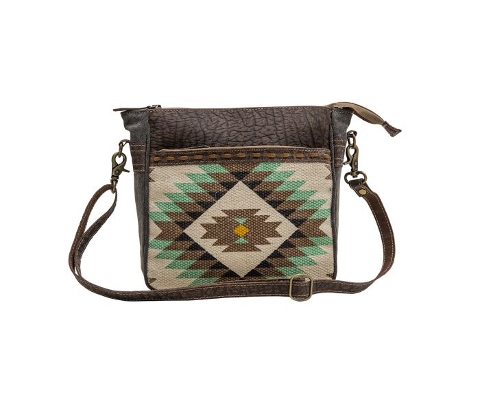 Small, leather and canvas crossbody bag with leather back and adjustable strap.