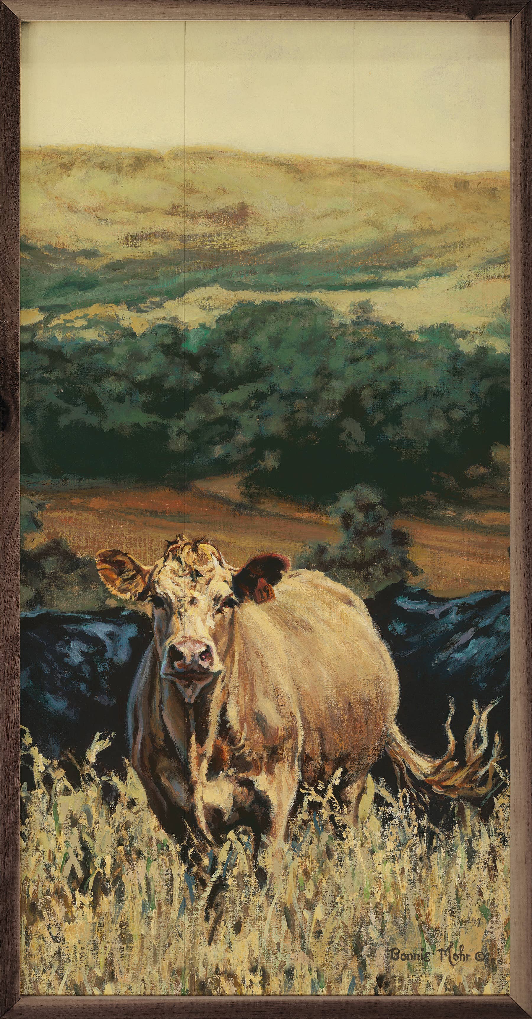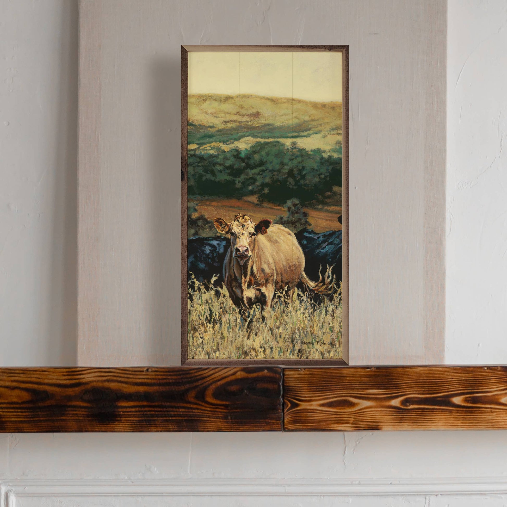 This unique piece is a simple way to bring beauty and charm to any wall or shelf within the home. It is made from high quality American hardwood planks with a hand painted face, and printed with UV cured ink, and is framed in a natural walnut frame. Each piece is unique with its own personality, marks, wood grain, and look. Easy to clean with a dry cloth.