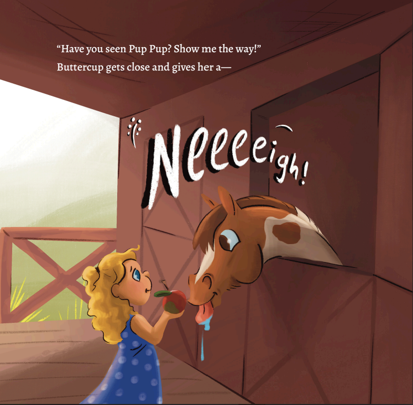 In the story, Daisy can't wait for her cousins to arrive for tea but when Daisy realizes that her sweet Pup Pup is gone, she sets off on the farm to ask all her farm friends for help. When the hunt for Pup Pup is over and Daisy finds her sweet pup, she realizes her new dress is covered in mud.
