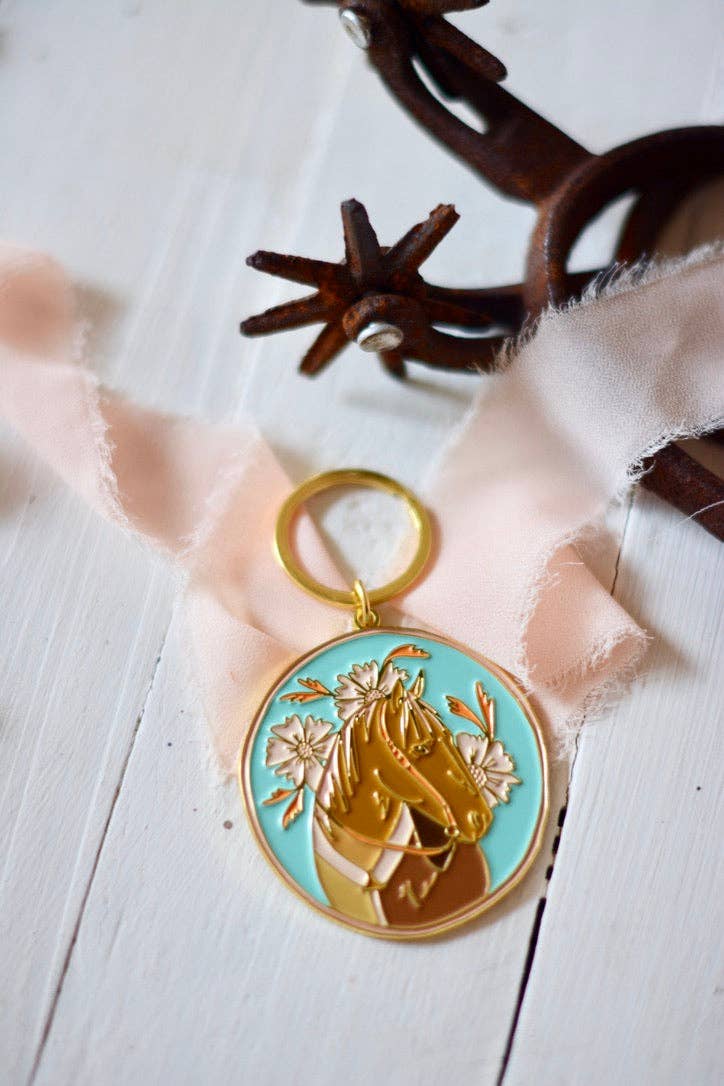 Western Floral Horse Gold and Turquoise Enamel Keychain
