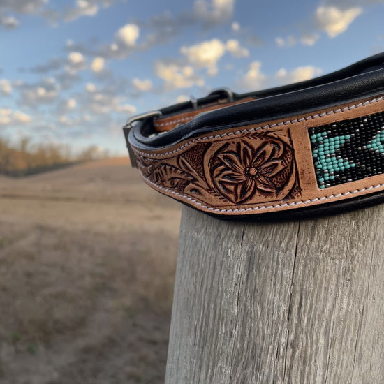 Western Leather Turquoise & Black Beaded Bling Dog Collar SMALL