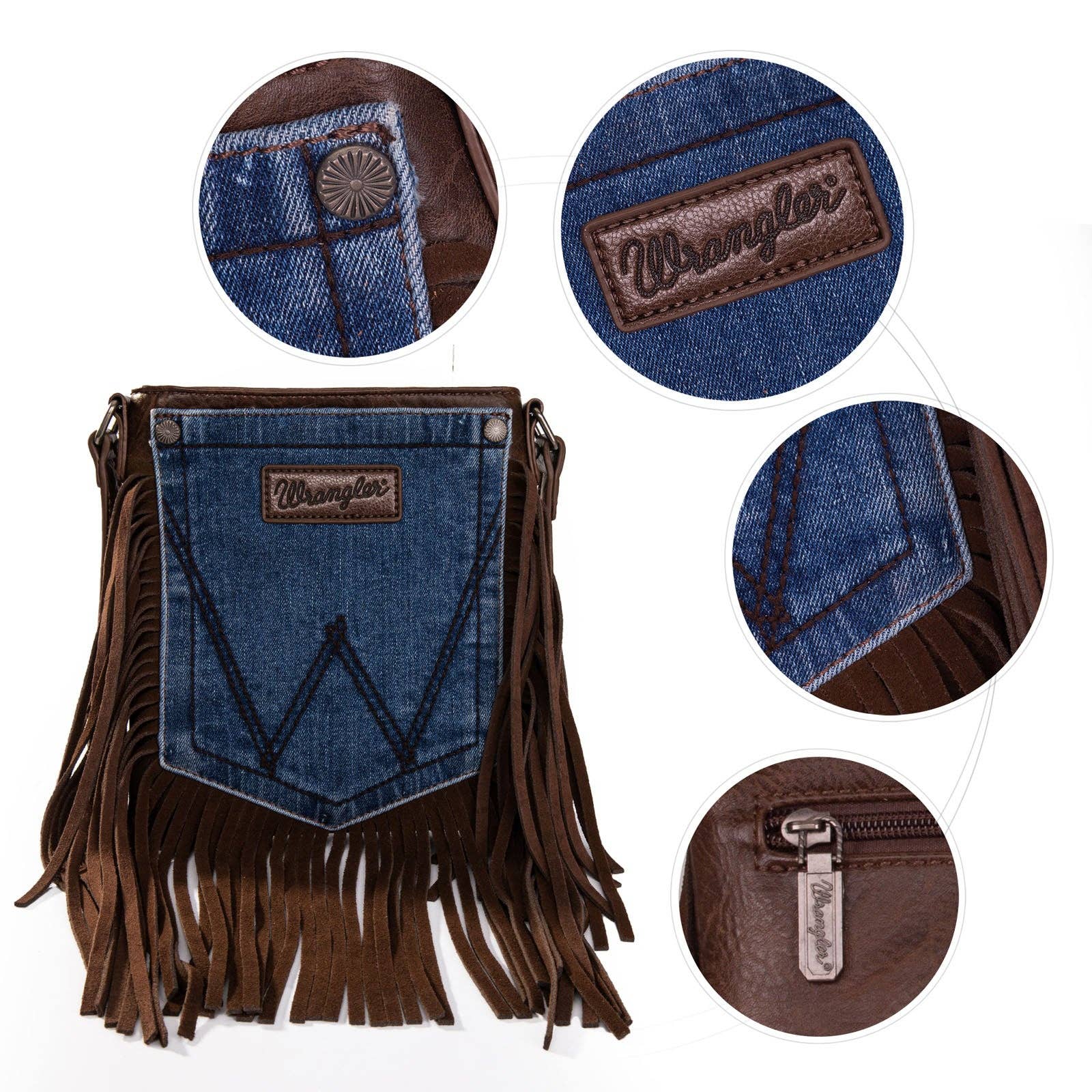 Wrangler Leather Fringe Jean Denim Pocket Crossbody: Coffee
