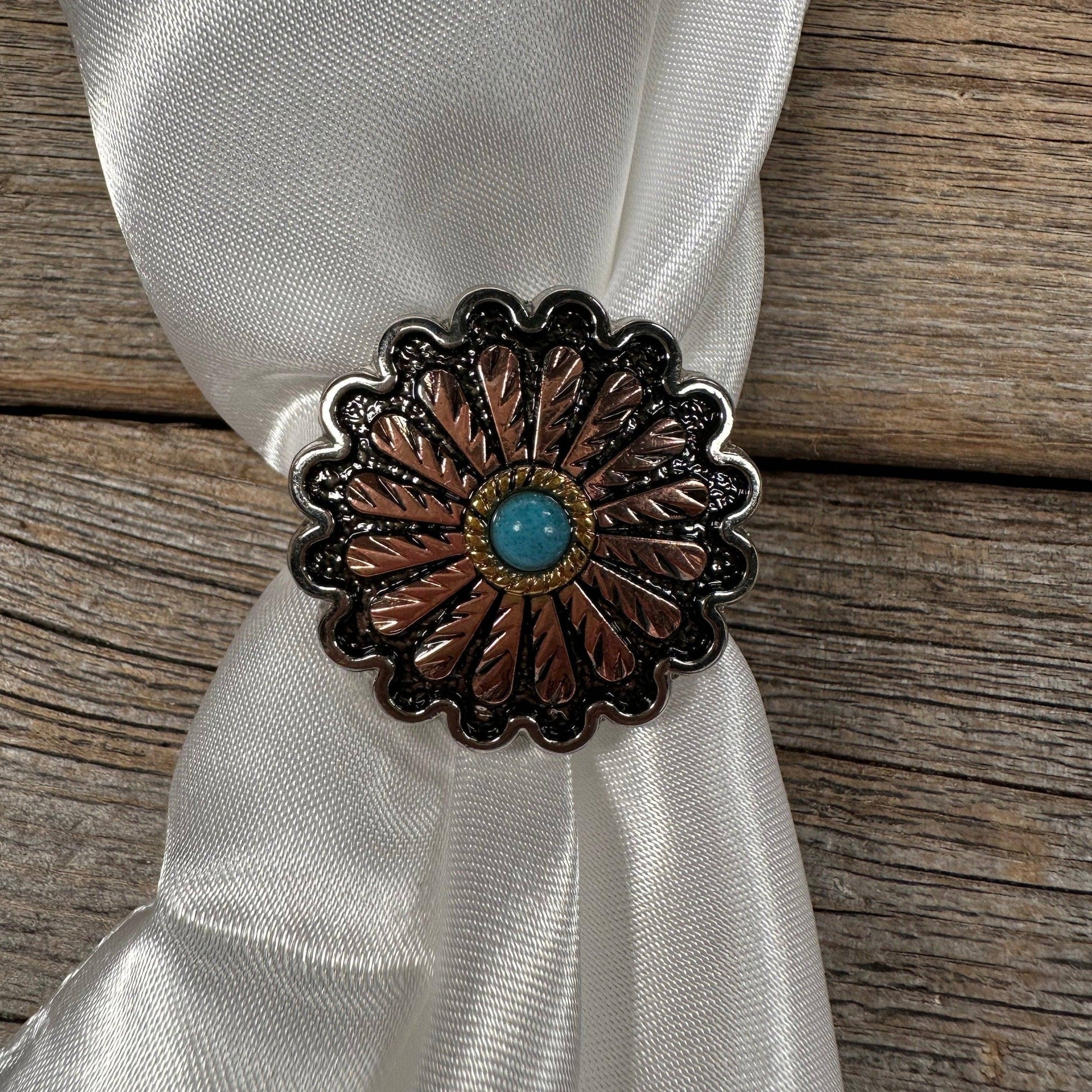 Antique silver with copper petals and a turquoise stone western concho slide (W220).