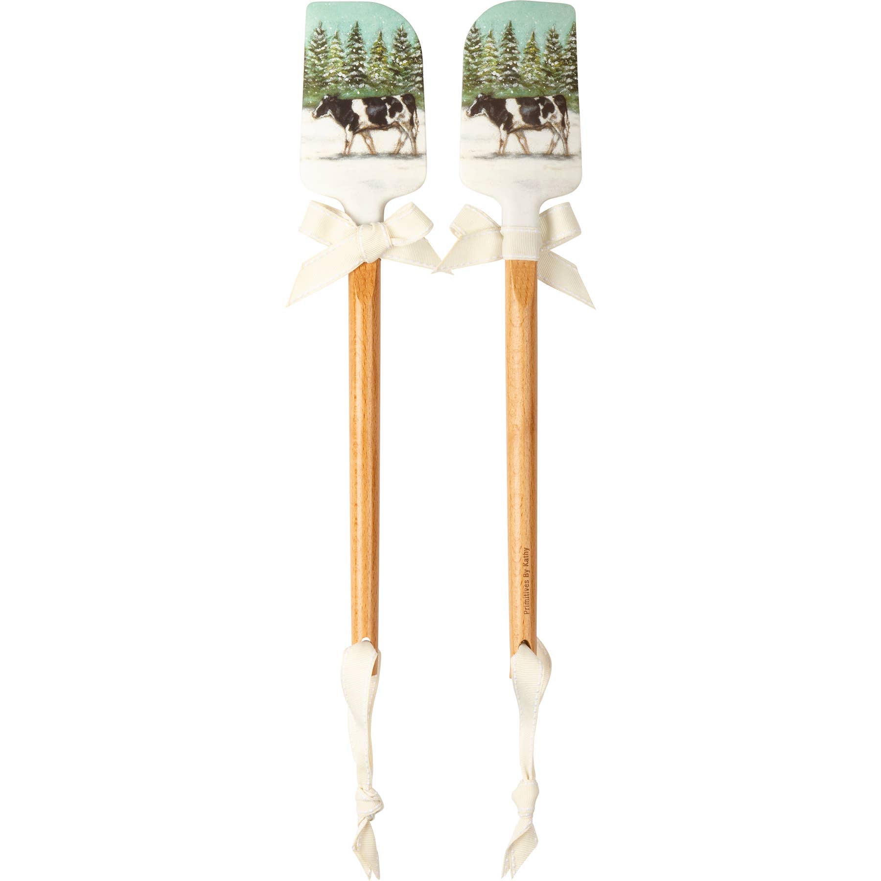 A double-sided silicone spatula, displaying a cow walking in a snowy landscape with evergreen trees as a backdrop. Design is replicated from original artwork painted onto burlap canvas, giving the art a unique depth and texture. The Winter Cow spatula features a logo engraved into wooden handle for added interest and a decorative bow and ribbon for hanging. Hand-wash recommended; not microwave safe.